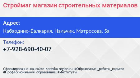 Строймаг, магазин строительных материалов по адресу Кабардино-Балкария, Нальчик, Матросова, 5а в дальнейшем Организация, размещена в следующих категориях: