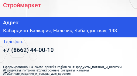 Строймаркет по адресу Кабардино-Балкария, Нальчик, Кабардинская, 143 в дальнейшем Организация, размещена в следующих категориях: