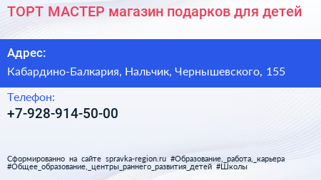 ТОРТ-МАСТЕР, магазин подарков для детей по адресу Кабардино-Балкария, Нальчик, Чернышевского, 155 в дальнейшем Организация, размещена в следующих категориях: