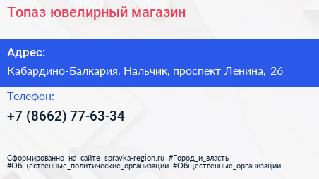 Топаз, ювелирный магазин по адресу Кабардино-Балкария, Нальчик, проспект Ленина, 26 в дальнейшем Организация, размещена в следующих категориях: