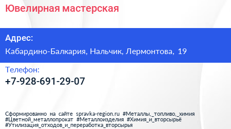 Ювелирная мастерская по адресу Кабардино-Балкария, Нальчик, Лермонтова, 19 в дальнейшем Организация, размещена в следующих категориях:
