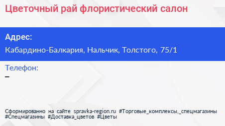 Цветочный рай, флористический салон по адресу Кабардино-Балкария, Нальчик, Толстого, 75/1 в дальнейшем Организация, размещена в следующих категориях:
