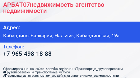 АРБАТ07недвижимость, агентство недвижимости по адресу Кабардино-Балкария, Нальчик, Кабардинская, 19а в дальнейшем Организация, размещена в следующих категориях: