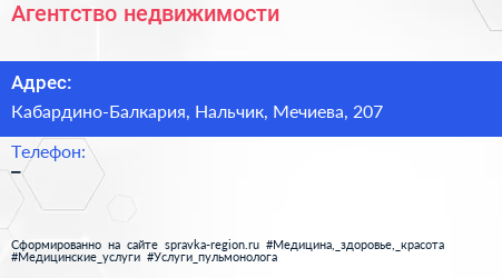 Агентство недвижимости по адресу Кабардино-Балкария, Нальчик, Мечиева, 207 в дальнейшем Организация, размещена в следующих категориях: