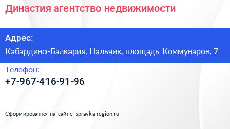 Династия, агентство недвижимости по адресу Кабардино-Балкария, Нальчик, площадь Коммунаров, 7 в дальнейшем Организация, размещена в следующих категориях: