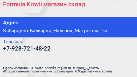 Formula Krovli, магазин-склад по адресу Кабардино-Балкария, Нальчик, Матросова, 5а в дальнейшем Организация, размещена в следующих категориях: