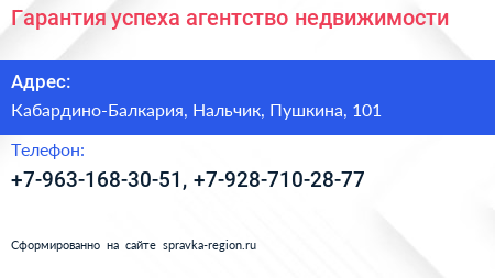 Гарантия успеха, агентство недвижимости по адресу Кабардино-Балкария, Нальчик, Пушкина, 101 в дальнейшем Организация, размещена в следующих категориях: