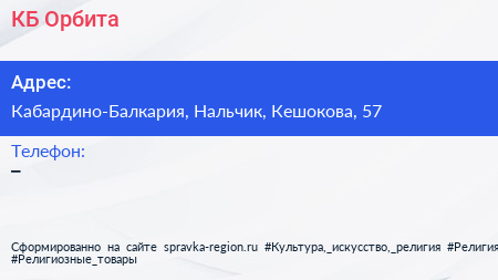 КБ Орбита по адресу Кабардино-Балкария, Нальчик, Кешокова, 57 в дальнейшем Организация, размещена в следующих категориях:
