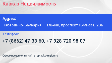 Кавказ-Недвижимость по адресу Кабардино-Балкария, Нальчик, проспект Кулиева, 28а в дальнейшем Организация, размещена в следующих категориях: