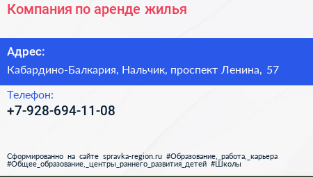 Компания по аренде жилья по адресу Кабардино-Балкария, Нальчик, проспект Ленина, 57 в дальнейшем Организация, размещена в следующих категориях: