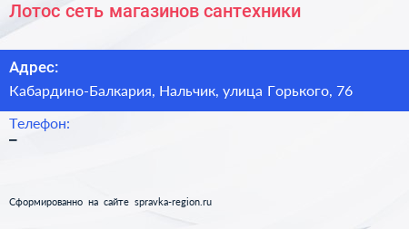 Лотос, сеть магазинов сантехники по адресу Кабардино-Балкария, Нальчик, улица Горького, 76 в дальнейшем Организация, размещена в следующих категориях: