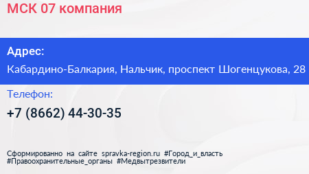 МСК-07, компания по адресу Кабардино-Балкария, Нальчик, проспект Шогенцукова, 28 в дальнейшем Организация, размещена в следующих категориях: