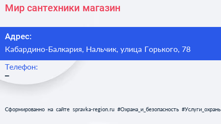 Мир сантехники, магазин по адресу Кабардино-Балкария, Нальчик, улица Горького, 78 в дальнейшем Организация, размещена в следующих категориях: