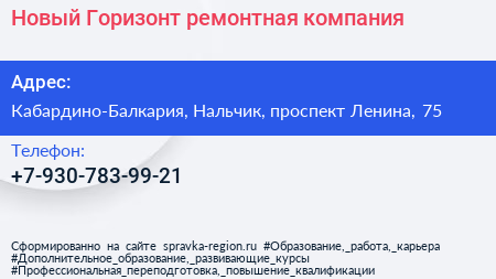 Новый Горизонт, ремонтная компания по адресу Кабардино-Балкария, Нальчик, проспект Ленина, 75 в дальнейшем Организация, размещена в следующих категориях: