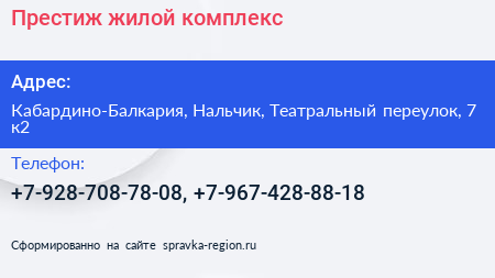 Престиж, жилой комплекс по адресу Кабардино-Балкария, Нальчик, Театральный переулок, 7 к2 в дальнейшем Организация, размещена в следующих категориях: