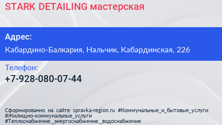 STARK DETAILING, мастерская по адресу Кабардино-Балкария, Нальчик, Кабардинская, 226 в дальнейшем Организация, размещена в следующих категориях: