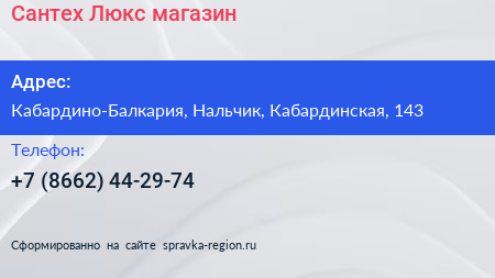 Сантех-Люкс, магазин по адресу Кабардино-Балкария, Нальчик, Кабардинская, 143 в дальнейшем Организация, размещена в следующих категориях: