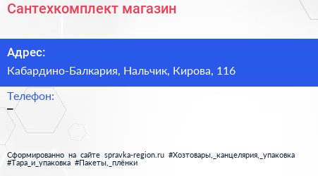 Сантехкомплект, магазин по адресу Кабардино-Балкария, Нальчик, Кирова, 116 в дальнейшем Организация, размещена в следующих категориях: