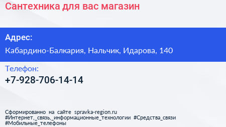 Сантехника для вас, магазин по адресу Кабардино-Балкария, Нальчик, Идарова, 140 в дальнейшем Организация, размещена в следующих категориях: