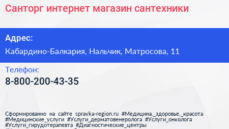 Санторг, интернет-магазин сантехники по адресу Кабардино-Балкария, Нальчик, Матросова, 11 в дальнейшем Организация, размещена в следующих категориях: