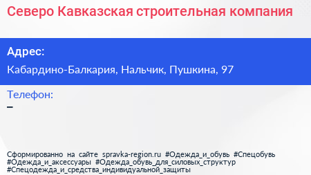Северо-Кавказская строительная компания по адресу Кабардино-Балкария, Нальчик, Пушкина, 97 в дальнейшем Организация, размещена в следующих категориях: