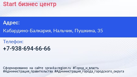 Start, бизнес-центр по адресу Кабардино-Балкария, Нальчик, Пушкина, 35 в дальнейшем Организация, размещена в следующих категориях: