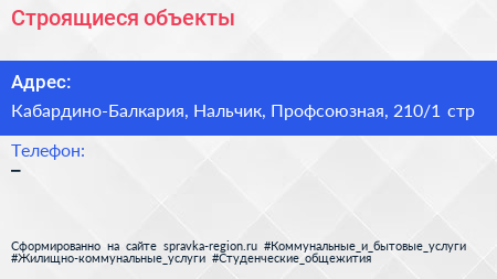 Строящиеся объекты по адресу Кабардино-Балкария, Нальчик, Профсоюзная, 210/1 стр в дальнейшем Организация, размещена в следующих категориях: