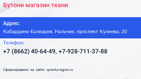 Бутони, магазин ткани по адресу Кабардино-Балкария, Нальчик, проспект Кулиева, 20 в дальнейшем Организация, размещена в следующих категориях: