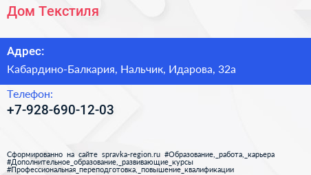 Дом Текстиля по адресу Кабардино-Балкария, Нальчик, Идарова, 32а в дальнейшем Организация, размещена в следующих категориях: