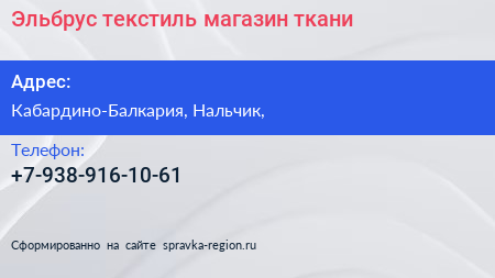 Эльбрус текстиль, магазин ткани по адресу Кабардино-Балкария, Нальчик, в дальнейшем Организация, размещена в следующих категориях: