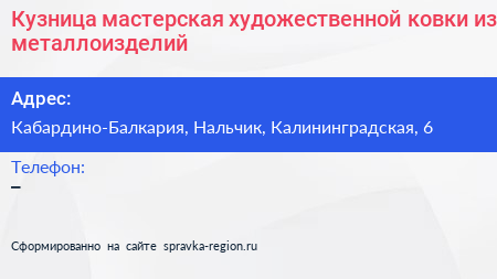 Кузница, мастерская художественной ковки из металлоизделий по адресу Кабардино-Балкария, Нальчик, Калининградская, 6 в дальнейшем Организация, размещена в следующих категориях: