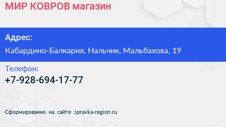 МИР КОВРОВ, магазин по адресу Кабардино-Балкария, Нальчик, Мальбахова, 19 в дальнейшем Организация, размещена в следующих категориях: