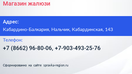 Магазин жалюзи по адресу Кабардино-Балкария, Нальчик, Кабардинская, 143 в дальнейшем Организация, размещена в следующих категориях: