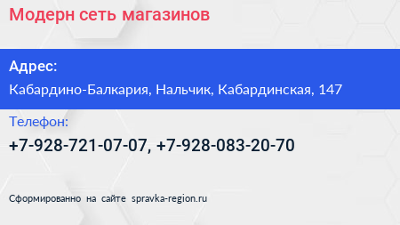 Модерн, сеть магазинов по адресу Кабардино-Балкария, Нальчик, Кабардинская, 147 в дальнейшем Организация, размещена в следующих категориях:
