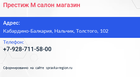 Престиж-М, салон-магазин по адресу Кабардино-Балкария, Нальчик, Толстого, 102 в дальнейшем Организация, размещена в следующих категориях: