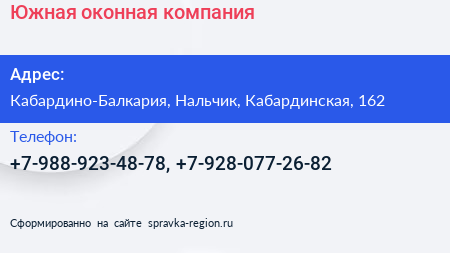 Южная, оконная компания по адресу Кабардино-Балкария, Нальчик, Кабардинская, 162 в дальнейшем Организация, размещена в следующих категориях: