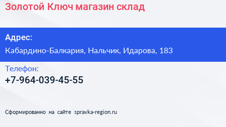 Золотой Ключ, магазин-склад по адресу Кабардино-Балкария, Нальчик, Идарова, 183 в дальнейшем Организация, размещена в следующих категориях: