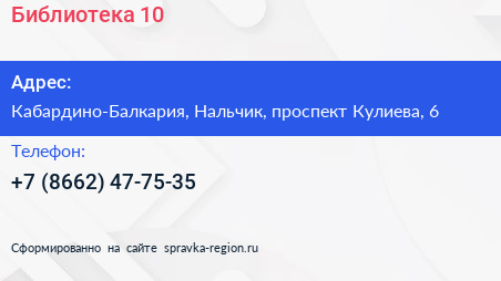 Библиотека №10 по адресу Кабардино-Балкария, Нальчик, проспект Кулиева, 6 в дальнейшем Организация, размещена в следующих категориях: