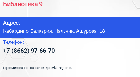 Библиотека №9 по адресу Кабардино-Балкария, Нальчик, Ашурова, 18 в дальнейшем Организация, размещена в следующих категориях: