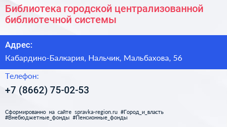 Библиотека городской централизованной библиотечной системы по адресу Кабардино-Балкария, Нальчик, Мальбахова, 56 в дальнейшем Организация, размещена в следующих категориях:
