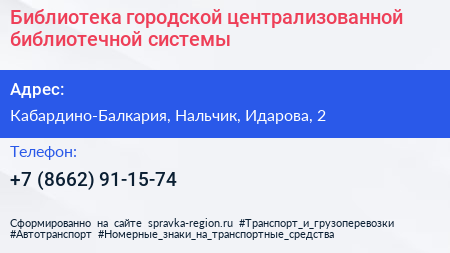 Библиотека городской централизованной библиотечной системы по адресу Кабардино-Балкария, Нальчик, Идарова, 2 в дальнейшем Организация, размещена в следующих категориях: