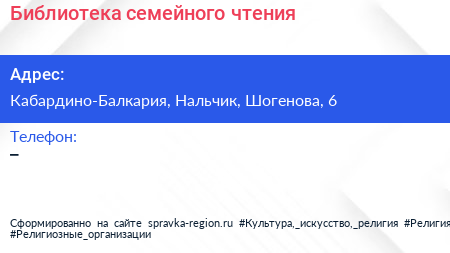 Библиотека семейного чтения по адресу Кабардино-Балкария, Нальчик, Шогенова, 6 в дальнейшем Организация, размещена в следующих категориях: