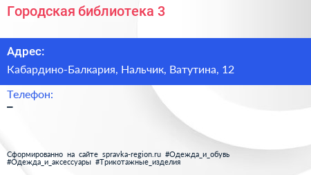 Городская библиотека №3 по адресу Кабардино-Балкария, Нальчик, Ватутина, 12 в дальнейшем Организация, размещена в следующих категориях: