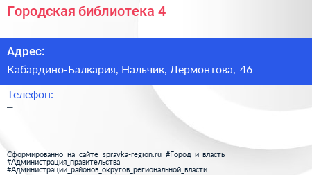 Городская библиотека №4 по адресу Кабардино-Балкария, Нальчик, Лермонтова, 46 в дальнейшем Организация, размещена в следующих категориях: