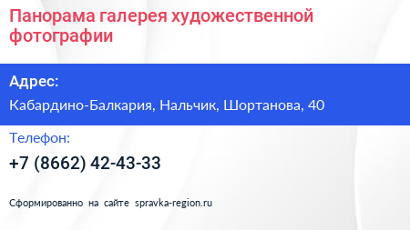Панорама, галерея художественной фотографии по адресу Кабардино-Балкария, Нальчик, Шортанова, 40 в дальнейшем Организация, размещена в следующих категориях: