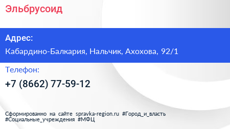 Эльбрусоид по адресу Кабардино-Балкария, Нальчик, Ахохова, 92/1 в дальнейшем Организация, размещена в следующих категориях:
