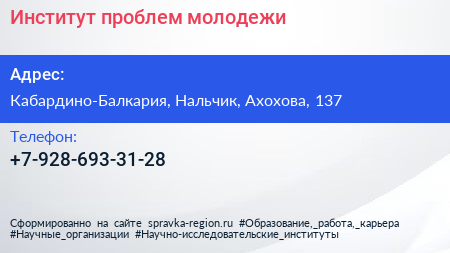 Институт проблем молодежи по адресу Кабардино-Балкария, Нальчик, Ахохова, 137 в дальнейшем Организация, размещена в следующих категориях: