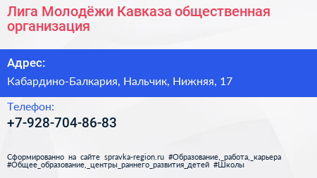 Лига Молодёжи Кавказа, общественная организация по адресу Кабардино-Балкария, Нальчик, Нижняя, 17 в дальнейшем Организация, размещена в следующих категориях: