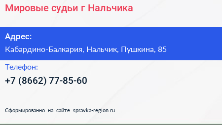 Мировые судьи г. Нальчика по адресу Кабардино-Балкария, Нальчик, Пушкина, 85 в дальнейшем Организация, размещена в следующих категориях: