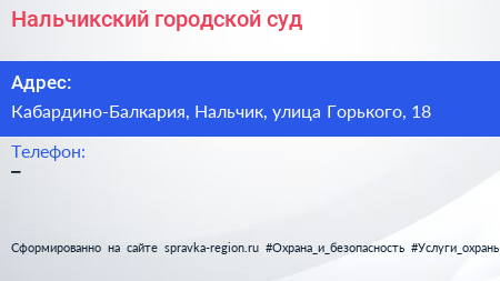 Нальчикский городской суд по адресу Кабардино-Балкария, Нальчик, улица Горького, 18 в дальнейшем Организация, размещена в следующих категориях:
